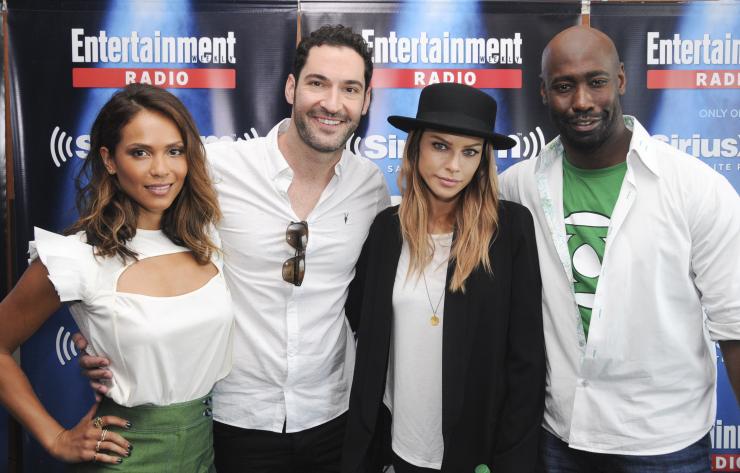 (front Left) Lucifer Tom Ellis, (far right) Chloe Dancer Lauren German (front right) Amenadiel DB Woodside